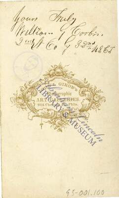The contents of the Abraham Lincoln Library and Museum's Carte-de-Visite Collection are in public domain. Online access is meant for research and educational purposes. Preferred Citation: “Corbin, William G. (signed) Back”, Carte de Visite Collection. Abraham Lincoln Library and Museum, Lincoln Memorial University, Harrogate, TN.