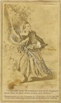A carte-de-visite card depicting Jefferson Davis (1808-1889), President of the Confederacy, evading capture in a dress.