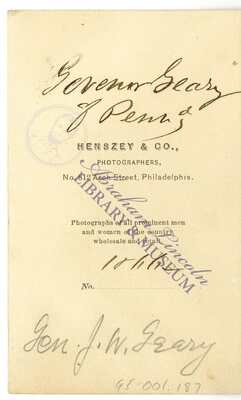 A back of carte-de-visite card of John White Geary, 1819-1873, a Union general in the American Civil War and politician.