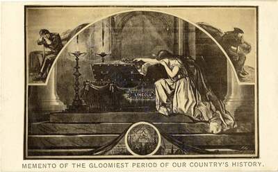 A carte-de-visite card of with the title "Memento of the Gloomiest Period of our Country's History". It depicts people reacting to President Lincoln's death.