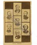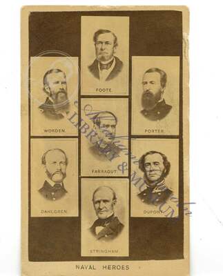A carte-de-visite card of the Union Naval Heroes during the American Civil War. From the top and going clock-wise there is Andrew Hull Foote, David Dixon Porter, Samuel Francis Du Pont, Silas H. Stringham, John A. Dahlgren, and John Lorimer Worden.