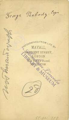 The back of a carte-de-visite card of George Peabody, 1795-1869, an American financier and philanthropist.