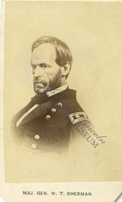 A carte-de-visite card of William Tecumseh Sherman, 1820-1891, a general in the Union Army during the American Civil War.