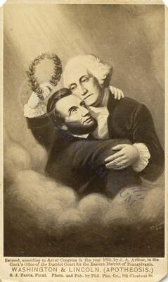 A carte-de-visite card of Washington and Lincoln (Apotheosis) without Angels.