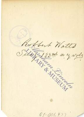 The contents of the Abraham Lincoln Library and Museum's Carte-de-Visite Collection are in public domain. Online access is meant for research and educational purposes. Preferred Citation: “Watts, Robert Back”, Carte de Visite Collection. Abraham Lincoln Library and Museum, Lincoln Memorial University, Harrogate, TN.